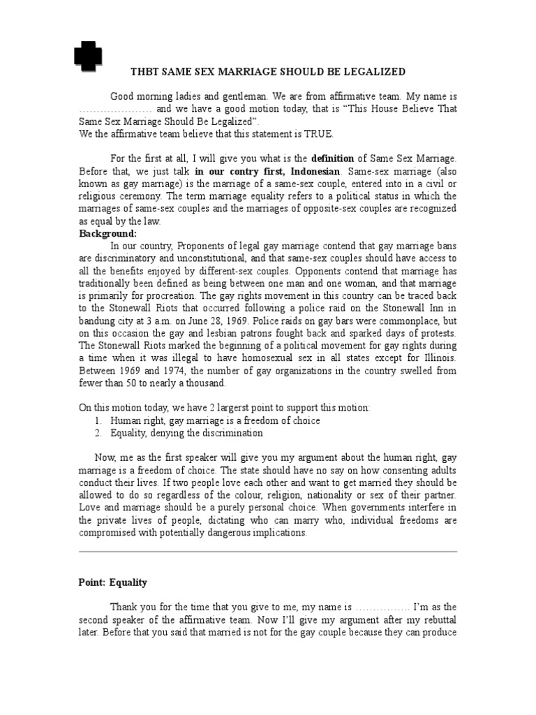 It is widely known that in countries where marijuana is illegal, should same sex marriage be legalized essay, authorities are stringent and will arrest any individual found in possession of the drug Sanger, However, as earlier mentioned, laws prohibiting the use of the drug do not prevent its consumption, and this means that many people are arrested and prosecuted for possessing it Sanger, State governments therefore use a lot of funds to support law enforcement agencies that seek to uphold laws prohibiting the use of marijuana Sanger, Since these actions do not limit consumption of marijuana, state governments should legalize the drug so as to save taxpayers money.